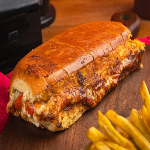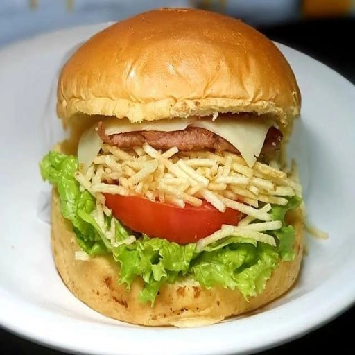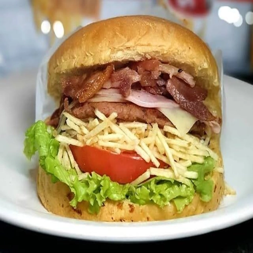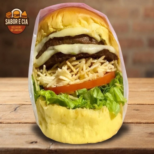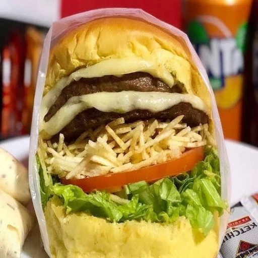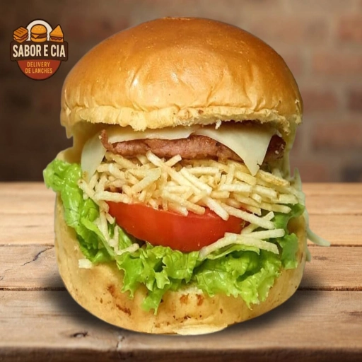 Hambúrguer suculento com Catupiry cremoso, tomate, cebola, batata palha crocante, alface, ketchup e maionese no pão ar... Ver completo
