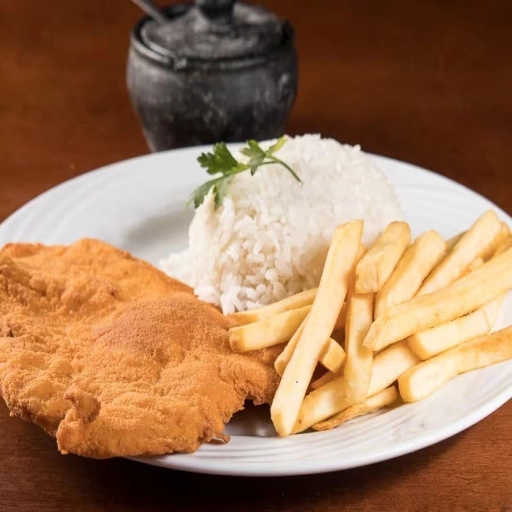 Filé de frango empanado e crocante, com arroz, feijão e batata frita ou purê. Clássico, saboroso e completo!