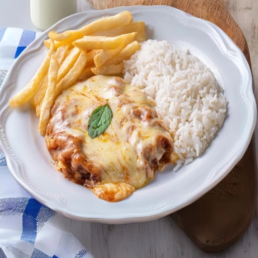 Filé de frango à parmegiana com molho, queijo derretido, arroz soltinho e batata frita crocante. Uma delÃcia irresist... Ver completo