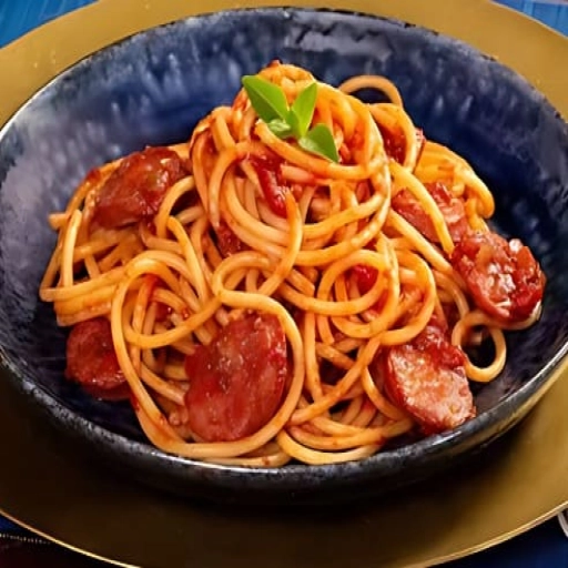 Espaguete ao molho de tomate artesanal com calabresa levemente frita, cebola, alho e temperos especiais. Uma combinaçã... Ver completo