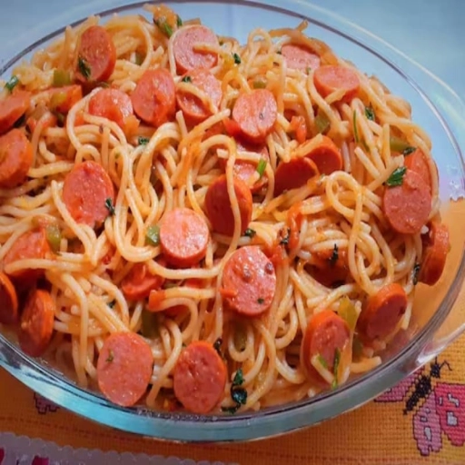 Espaguete ao molho caseiro de tomates, servido com salsicha fatiada e temperos especiais. Simples, saboroso e com gostin... Ver completo