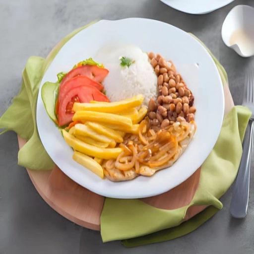 Filé de frango suculento e grelhado com cebola, acompanhado de arroz, feijão e batata frita. Leve, saboroso e completo... Ver completo