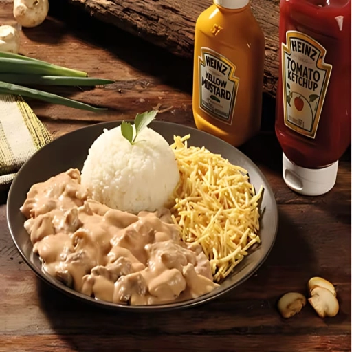 Strogonoff de Carne Premium + Fritas ou Batata Palha - (Serve bem 1 Pessoa)